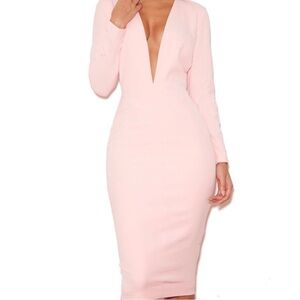 House of CB blush pink long sleeve deep v midi dress. The sleek design offers a flattering fit, making it a must-have in your wardrobe.