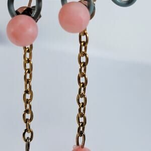 These charming earrings feature soft pink beads suspended from delicate gold chains. With their simple yet elegant design, they create a striking contrast between the pastel pink and the shiny gold, making them perfect for both everyday wear and special occasions. The smooth, rounded beads add a touch of softness, while the fine gold chain offers a sleek, modern feel. This combination of elements creates a chic and contemporary look that complements a variety of outfits. Whether you're dressing up for a formal event or adding a refined touch to your everyday wardrobe, these earrings bring elegance and sophistication to any look. The lightweight design ensures comfort, while the secure gold chain backing keeps the earrings in place all day long. Perfect for those who love minimalist jewelry with a hint of color, these earrings are an easy way to elevate your accessory game. Their timeless design makes them a versatile addition to any jewelry collection.