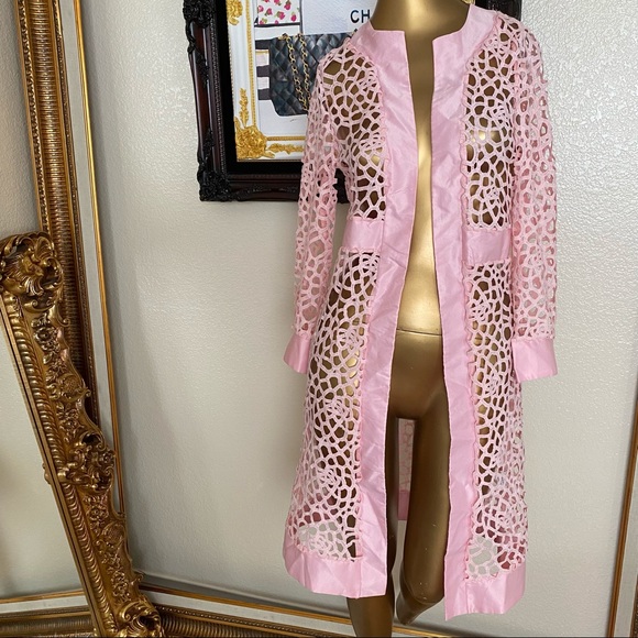 Pink open front duster , size small , excellent condition only wore a few times , open front , satin looking trim accent , no damage or wear . Comes from a non smoking home.