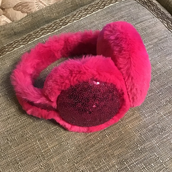 Pink fuzzy earmuffs with shiny sequins on the sides and headband. Keep your ears super warm and comfortable this winter.
