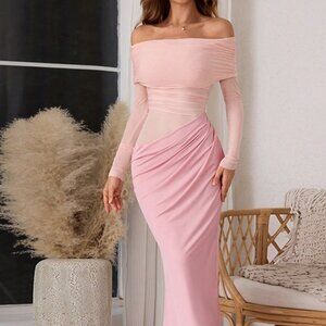 Pink Elegant Women's Off-Shoulder Mesh Hollow Out Maxi Sexy Fitted Dress