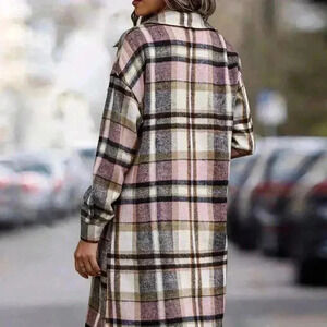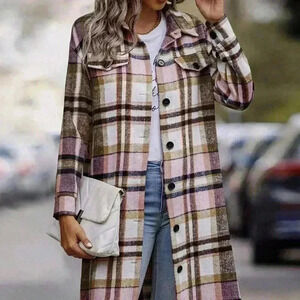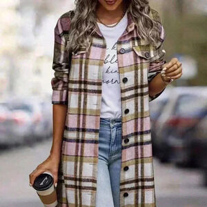 Pink Elegant Women's Plaid Long Sleeve Button Up Flannel Shirt Shacket