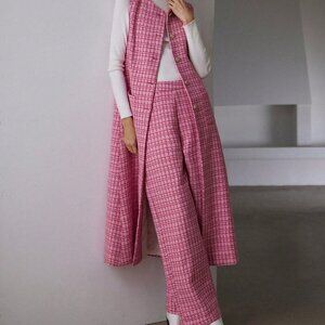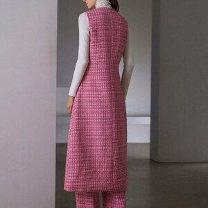 Pink Elegant Women's Tweed Long Sleeveless Cinched Waist Jacket & Pants Set