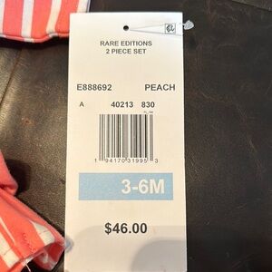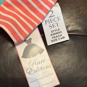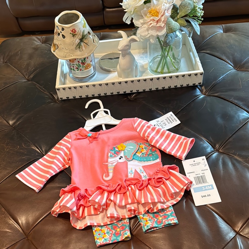 Adorable pink outfit with elephant design. Features ruffle details and striped sleeves. Includes matching floral leggings.