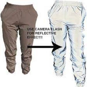 These pants are so fun! Would be perfect for high visibility running/ cycling, or out dancing or even just out and about running errands. These catch light like nothing i've ever seen. My camera doesn't know what to do with them! Pink Elephant reflective jogger pants with pockets size xs.