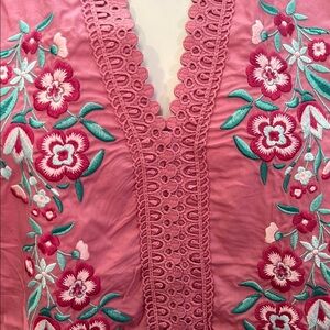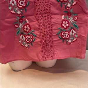 This stylish blouse showcases intricate floral embroidery on a soft pink fabric, complemented by a mandarin collar and short sleeves. The embellished design adds a touch of elegance, making it a perfect choice for any occasion.