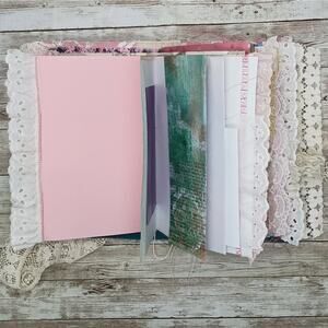 Lifetime: a pink, blue, and purple flower, birds, and butterfly junk journal. This two signature beauty has a handmade fabric cover. It provides a wonderfully unique way to journal for any purpose, scrapbook, or store your keepsakes. This is a lovely way to stay organized while expressing yourself. I don't use kits or templates in my work, ensuring a unique journal you won't find anywhere else.