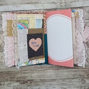 Wish: a pink, blue, and purple flower, birds, and butterfly junk journal. This two signature beauty has a handmade fabric cover. It provides a wonderfully unique way to journal for any purpose, scrapbook, or store your keepsakes. This is a lovely way to stay organized while expressing yourself. I don't use kits or templates in my work, ensuring a unique journal you won't find anywhere else.