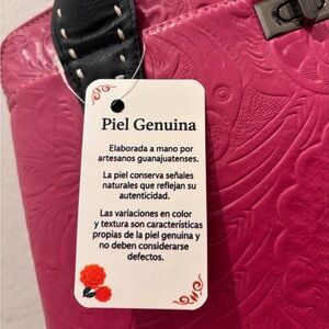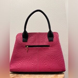 Stylish pink embossed handbag with black handles. Perfect for adding a pop of color to any outfit.