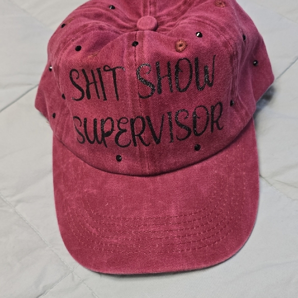 New Stylish burgundy ball cap with black vinyl lettering and black stones scattered throughout cap. Adjustable in back. Perfect for casual wear.