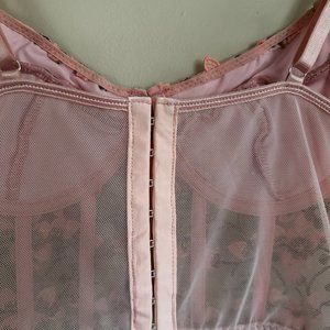 This is a cropped, corset with floral embroidery on a mesh top. Clasp closures along the back. Never worn!