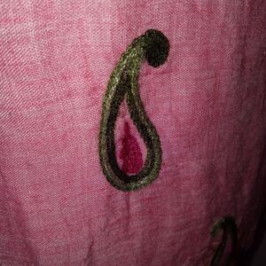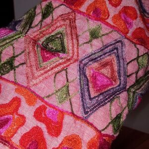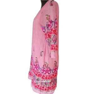 Fully lined, scoop neck, light pink cotton gauze fabric with heavily embroidered hem and sleeves. size M
