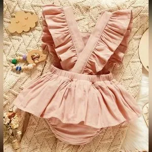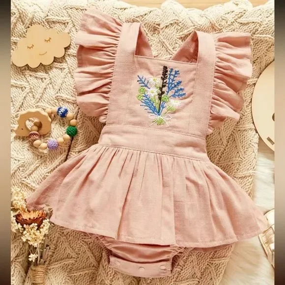 Pink romper with ruffled straps and skirt. It has embroidered floral design in front. New in package
