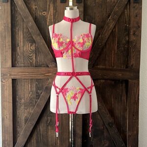 Pink Embroidered halter Ring Linked Harness Garter Lingerie Luxury Set Thong