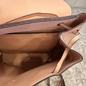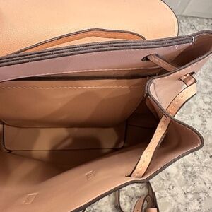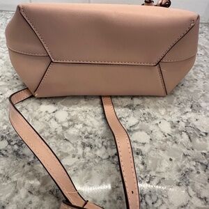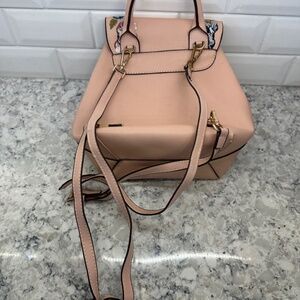 Gorgeous embroidery on a pink leather like mini backpack. I am not sure if it is leather. It is softer and more pliable than most man made materials. Measures approx. 10 inches high, 11 inches wide, and 5 inches deep.