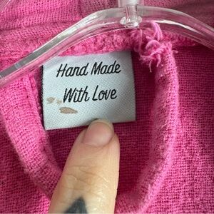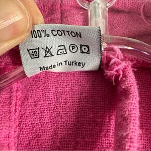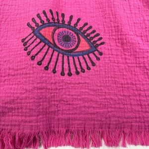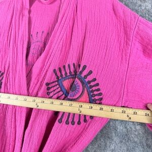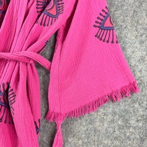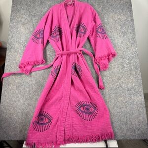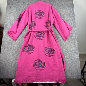 Vibrant pink robe with eye patterns. Features fringe details and a tie belt.