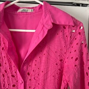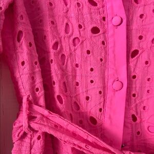 Bright pink button up dress with eyelet fabric. Fits more like a true small. Great classic cut and style.