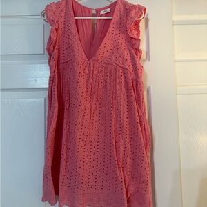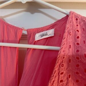 Chic pink blouse with eyelet pattern. Features ruffled sleeves and V-neck. Ideal for a fashionable outfit.
