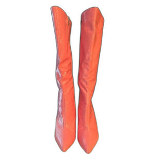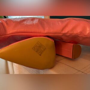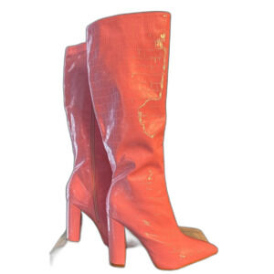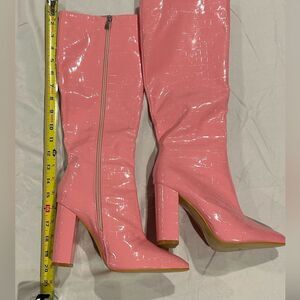 What girl does not want to be pretty in pink? These unique knee-high boots with a 4 inch heel make a statement! They are size 37 European or 6 1/2 US. The interior and soles of the shoes look like brand new. With the chunky heel and pointed toe, the boots are reminiscent of the 60s but with a modern edge.
