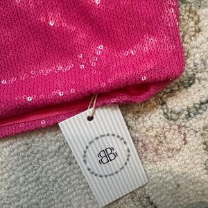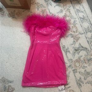 Stand out in this vibrant pink mini dress featuring a playful feathered neckline. Perfect for a night out or special occasion.
