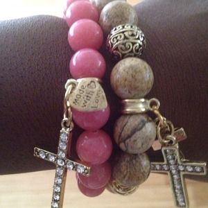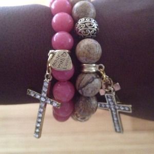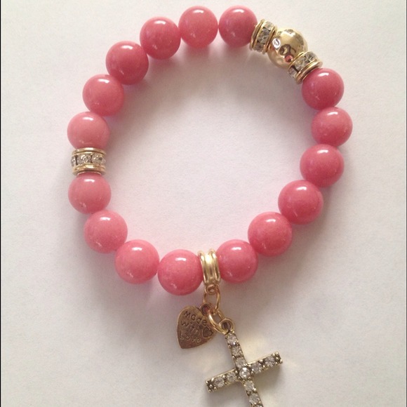 Made with love pink beaded bracelet with rhinestone cross and heart charm. Great for stacking with other bracelets or to wear alone.