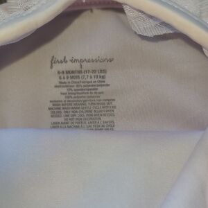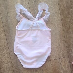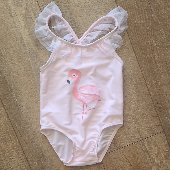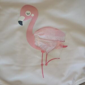 Adorable pink swimsuit with a flamingo design and ruffle details.