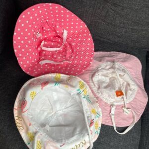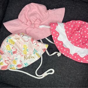 Adorable set of kids sun hats featuring a playful pink flamingo design and a charming pink polka dot pattern. Perfect for sunny days, these hats offer style and protection.