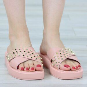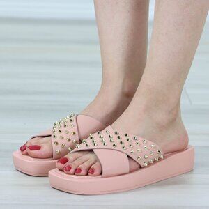 Pink Flat Sliders Sandals Slip On Faux Leather Gold Metal Stud Cross Over