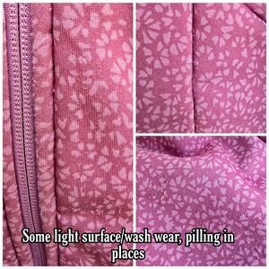 Stretch fleece fabric, Pink (purple/mauve undertones) abstract flower fractal mosaic print. Full zip front, mock neck, long sleeves. Zipper pockets: 2 side pockets, 1 chest pocket. Fleece inside. Issues noted in photos. Very good preowned condition, overall. Size Large Lightweight Soft Shell Fleece Jacket Sweater Zip Up Outdoor Cardigan by L.L. Bean.