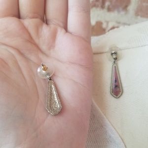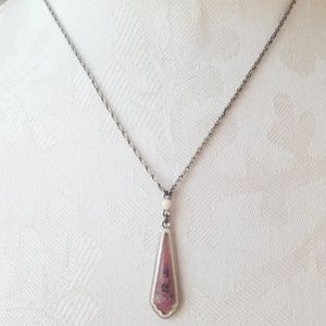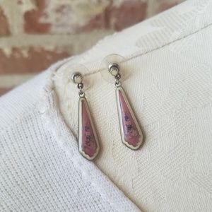 Vintage (decade unknown) 1920s-style set of drop earrings and a necklace, featuring matching dusty-rose pink colored enamel pendant/dangles that have a floral design in the center and a pearlescent-white border, and silver-toned metal chain (necklace), and flat post backs (earrings).