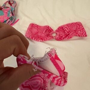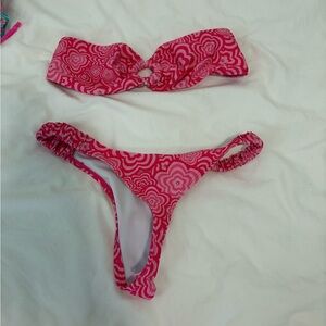 Stylish pink floral bikini set. Features a bandeau top and cheeky bottoms.