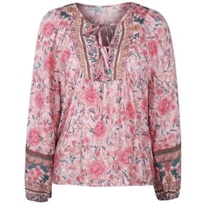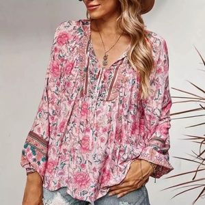 Floral printed boho style peasant top with v-neckline that can be worn tied or open. Wider sleeves with elastic hem.