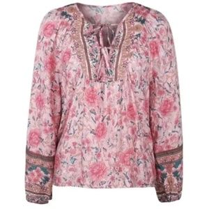 Floral printed boho style peasant top with v-neckline that can be worn tied or open. Wider sleeves with elastic hem.
