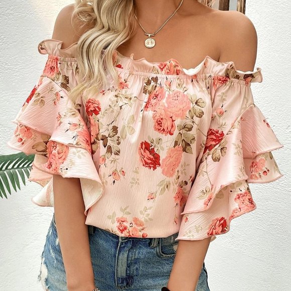 Pink Floral Boho Off Shoulder Ruffled Blouse