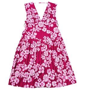 Stretchy fabric in a large scale hibiscus cherry dogwood flower print in a deep reddish pink cerise color (almost red) & white. Sleeveless bodice w/ deep plunge v-neckline, low plunge v back w/ strap at top edge. Removable wide belt, pleated accordion skirt, rear zip. Bottom edge of skirt is raw/unfinished by design. Minor shelfwear issue noted in photos. New, with tags. Size 12 by ASOS.