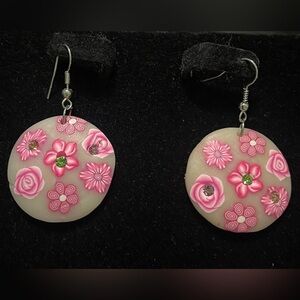 Beautiful resin earrings with crystals and pink floral designs. Perfect for adding a touch of elegance.