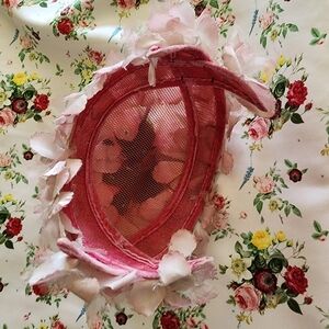 Elegant pink fascinator hat with floral accents. Perfect for special occasions.