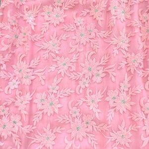 Charming pink Punjabi suit featuring floral embroidery and lace accents. Comes with cropped stretch pants with chunni. Please see measurements in the listing.