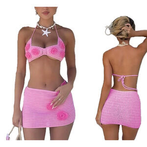 Pink Floral Knitted Crochet Coquette Boho Festival Halter Top Mini Skirt Set SML
