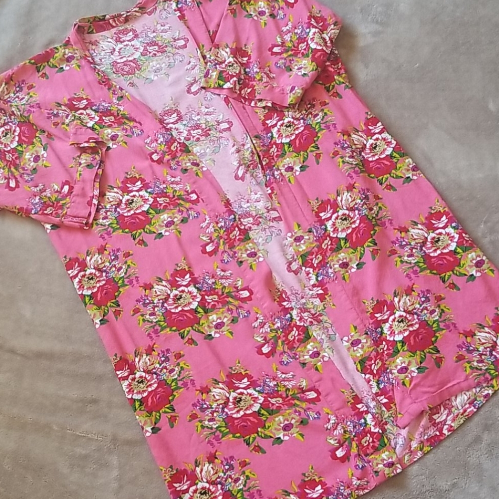 Lightweight bubblegum pink floral robe. Comes with tie. Fit is pictured best in last picture, where model is 5'0".