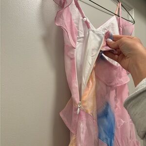 Elegant pink dress with floral patterns and ruffle details. Features blue and yellow accents.
