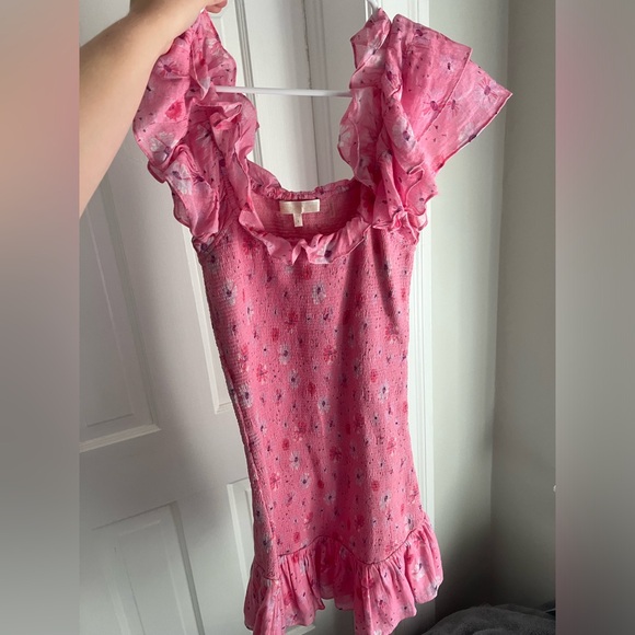 Charming pink dress with floral pattern and ruffle details. Perfect for a stylish look.