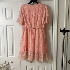 Charming pink dress with floral pattern. Features ruffle details and a V-neckline. boutique dress