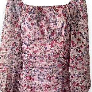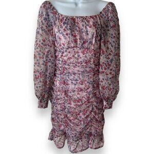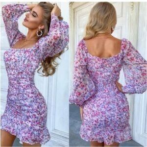 Pink Floral Ruffle Hem Ruched Bodycon Dress