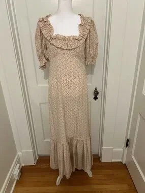 Soft cream floral maxi dress with a romantic ruffle neckline. Lightweight fabric with puff sleeves and a flowing skirt. Feminine silhouette that flatters the figure. Easy, elegant choice for daytime or special occasions.