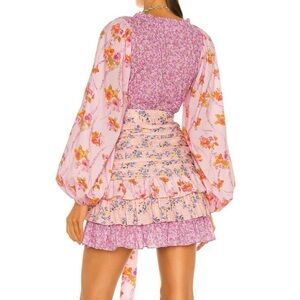 This charming mini dress is perfect for a wedding guest or cocktail event, featuring a tiered, ruffled skirt and a flattering wrap-style bodice with a v-neckline. The long bishop sleeves add a touch of elegance, while the tie front accentuates the waist, creating a graceful silhouette. Inspired by Love Shack Fancy, worn once.