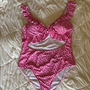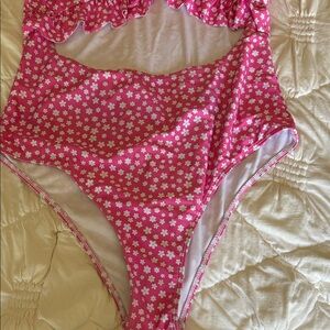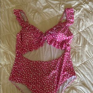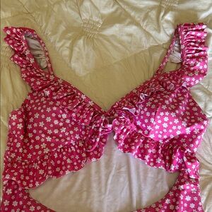 Cute pink one-piece swimsuit with all-over small white floral print. Ruffle straps and bust detail. Front cutout adds a flirty touch. Soft lined interior.