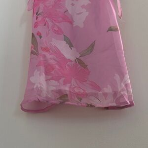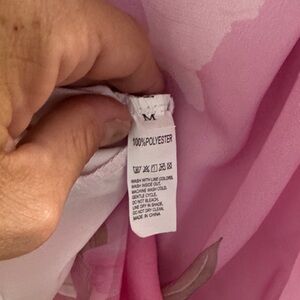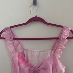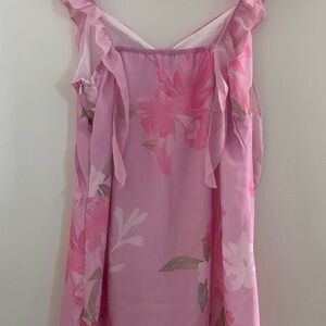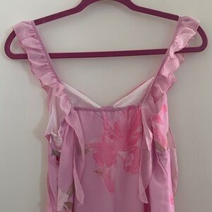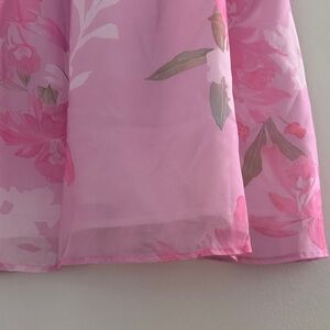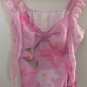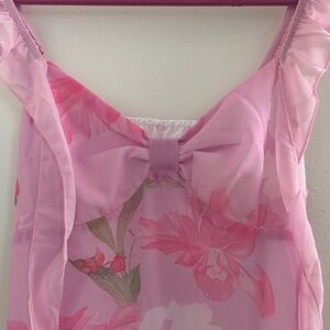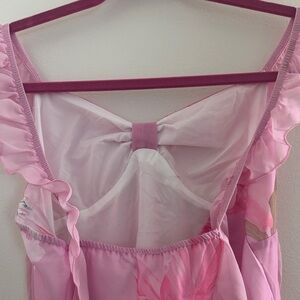 Whimsical pink babydoll top/ short dress. Size medium. Sheer, flowy material. Satin lined slip attached to dress inside. Strawberry-ish, floral design. Cutie ruffle straps and detail, front and back. Zipper left side. 100%polyester. Hand wash, delicate. Sweetheart neckline. Perfect for a coquette look!