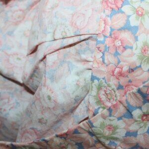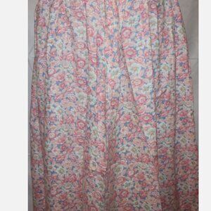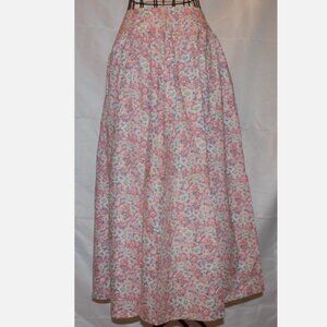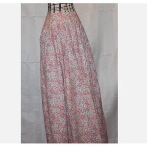 Vintage floral skirt in pink, light green, and light blue. Side zipper, pleated waistline. No tags – looks like a home machine-stitched item. Waist is 26”, hip is 54”, length is 34”. Fabric is cotton blend. In excellent condition.