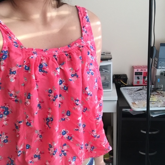 LIKE NEW hot pink tank top with floral designs. The back has a little slit to show some skin. Really flattering and perfect for spring and summer. I got it at Hollister for $24 and selling because it's too big for me